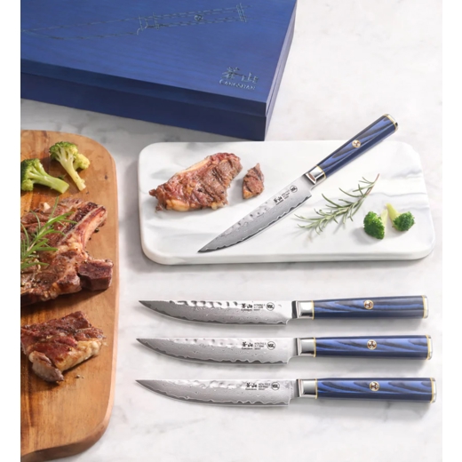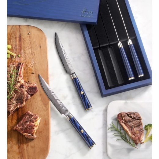 Steikarhnífarnir koma í fallegri viðaröskju sem er blá á litinn.