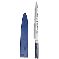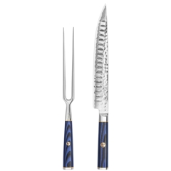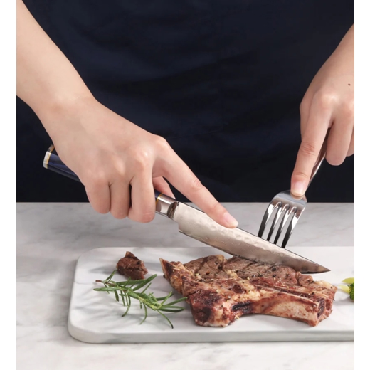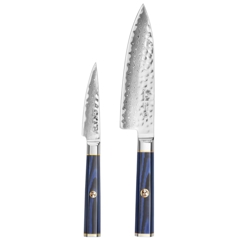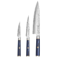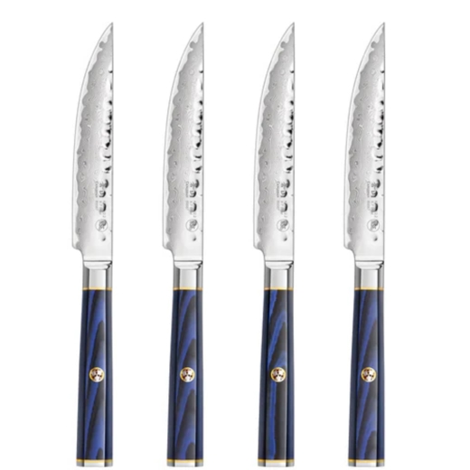Kita-hnífarnir eru hannaðir úr X-7 Damaskus-stáli með hamraðri áferð.