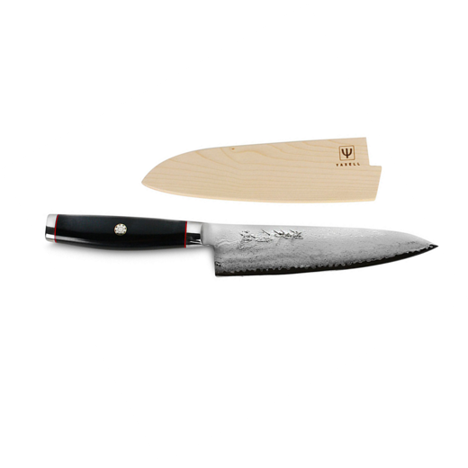 Super Gou Ypsilon hnífarnir frá Yaxell hafa SG2 Micro carbide ryðfrían kjarna sem mælist með harðleika stig upp á HRC63. Kjarninn er umlukin 96 lögum af ryðfríu stáli sitthvoru megin og er í heildina 193 laga hnífur. Handfangið er úr Micarta og merkt með samurai crest. Með öllum hnífum í Ypsilon línunni fylgir hnífaslíður úr bambus.