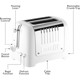 Dualit Lite brauðristirnar eru stílhreinar og endingargóðar. Beyglu hnappur til að rista bollur/beyglur (ristar aðra hliðina og hitar hina). Handvirkur lyfti búnaður sem fer hátt upp til að brenna ekki fingur og gerir þér kleift að skoða brauðið á meðan það er að ristast. Afþíðingarstilling hitar varlega frosið brauð og auðvelt er að tæma mylsnubakkann. Non-slip fætur tryggja að hún haldist nákvæmlega þar sem þú vilt hafa hana fyrir minni sóðaskap og meira öryggi. Ristar allt að 60 sneiðar á klukkustund.